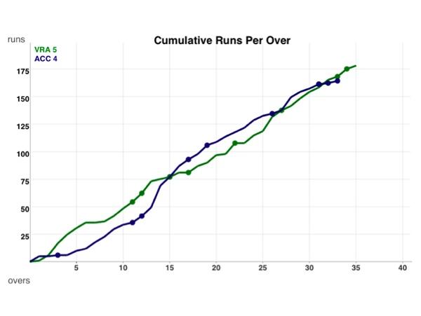 Dat ACC voor het eerst dit seizoen niet de 200 runs haalde was geen beletsel voor de winst. De 197 runs bleken ruim voldoende. Excelsior ’20 kwam niet verder dan een schamele 71 runs. Bas van der Heijde, inmiddels vader van een gezonde zoon, was weer van de partij en scoorde 54 runs. Verder waren er nuttige bijdragen van Graeme van Buuren (29) en later van Paul van Meekeren (20). In 28 van de beschikbare 50 overs werd Excelsior ’20 daarna gedeclasseerd. Paul van Meekeren was met 5 slachtoffers de grote man. Xander Udo schakelde met een fraaie ingooi topbat van Wijk uit. Ahmed Zulfiqar en Rehan Younis pakten beiden 2 wickets voor resp. 7 en 1 (!) runs.