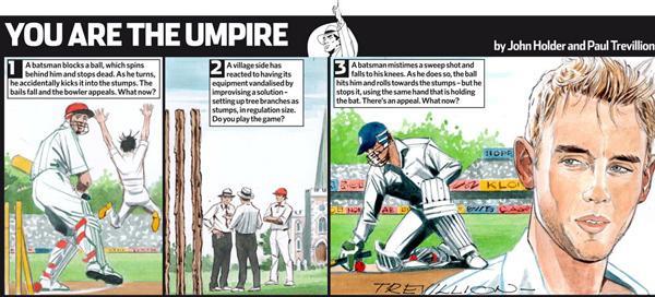 De Engelse krant The Guardian brengt al jaren een hele aardige strip in het sportkatern, een strip die net als z'n voetbaltegenhanger (sinds 1957) 'You're the Ref!' in Engeland cultstatus heeft verworven. Aan de hand van actuele gebeurtenissen in de betreffende sport worden de lezer lastige cases voorgelegd, die de nodige regelkennis vergen. De prachtige illustraties zijn van de hand van Paul Trevillion (74). *Klik op de afbeelding om te vergroten. Oplossingen worden gegeven door John Holder. We geven ze er in How's That! maar meteen bij.