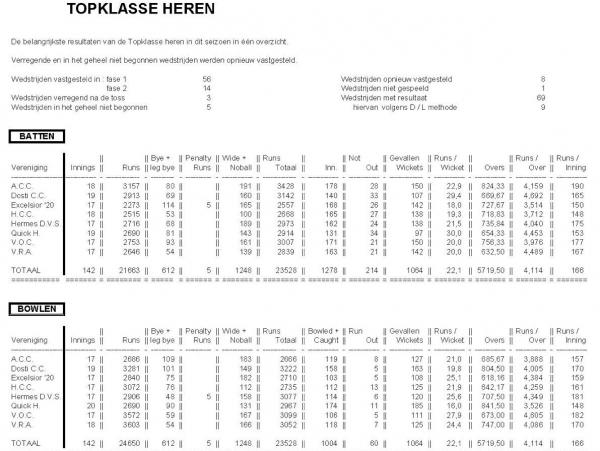 Runs van het bat : 1493 Byes/Leg byes: 62 Wides/No balls 254 Total tally: 1809 Overs gebat: 381,8 Over gemiddelde: 4,74 Gemiddeld aantal runs per wedstrijd: 151 Wickets gevallen: 83 Wickets genomen: 86 Aantal vangen: 35 Aantal stumpings: 2Een overgemiddelde van 4,74 is redelijk, maar moet eigenlijk wel hoger. 14% van onze runs kwam van wides. Als we dat nou eens met 2 % omlaag kunnen krijgen; dat betekent dat we naar 2110 runs van het bat moeten gaan, een verhoging van 620 runs. Een verhoging van het overgemiddelde naar 5,55. Dit moet haalbaar zijn toch? We haalden nu gemiddeld een totaal van 150. Dan ging het licht uit. Met de nieuwe doelstelling komen we gemiddeld op 176 per wedstrijd uit. Als we dit seizoen 176 gemiddeld hadden gemaakt, waren we hoogstwaarschijnlijk 2 winstpotjes rijker geweest… Rood en Wit thuis en Kampong uit. Wordt je dus gewoon tweede mee… Maar ja, Als en Hadden tellen niet in de topsport. We waren goed, beter dan Zami 1, Rood en Wit en Kampong. En daar zijn we blij mee. Als we volgend jaar nou ook nog boven HCC kunnen eindigen. Mijmer, mijmer… We hebben 83 wickets verloren en 86 wickets genomen, de balans schiet naar de goede kant door, maar niet met volle overgave. Het geeft wel aan dat we leuke spannende wedstrijden hebben gespeeld. Bijzonder is dat we alle wedstrijden hebben gespeeld, geen een wedstrijd is verregend.