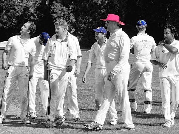De opdracht was "bedenk dit seizoen met je team een gedurfde en surrealistische cricket setting en breng dit 'professioneel' in beeld." Volgens de inzender voldoet de foto aan de voorwaarden. Wij hebben onze twijfels, maar willen u de foto niet onthouden. Surrealistisch is deze setting zeker en Kappelle met een roze sun hat is om meerdere redenen übergedurfd.