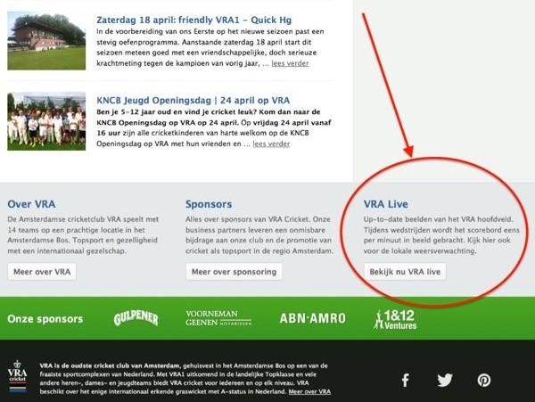 Al meer dan 15 jaar biedt de VRA website de mogelijkheid om een live videobeeld van het hoofdveld te bekijken en de actuele stand van de wedstrijd. Veel mensen zijn dit inmiddels vergeten of weten het gewoon niet, terwijl zij wel geinteresseerd zijn in de stand van de wedstrijd op het hoofdveld. De link naar VRA Live staat altijd op de homepage, helemaal rechts onderaan. Als je klikt op "Bekijk nu VRA Live" krijg je een actueel videobeeld van het hoofdveld dat elke 5 seconden wordt ververst. Tijdens wedstrijden wordt elke minuut een keer het scorebord getoond (gedurende 5 seconden). Zo kan je zien of er gespeeld wordt en op de hoogte blijven van de stand van de wedstrijd.