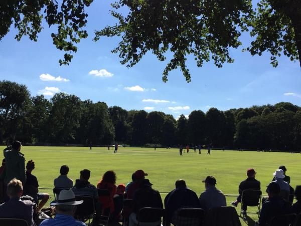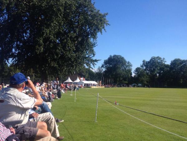 De zon draaide inmiddels erg fijn even achter de boomtoppen voor wat schaduw om in de innings van Nederland er weer achter vandaan te komen. De view from the boundary werd er alleen maar mooier van en samen met een regelmatige aanvoer van koude biertjes een prima basis om Nederland die 217 te gaan zien maken.