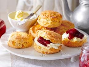 3. Put on a lightly floured baking tray; brush with milk. Bake for 18-20 minutes, until golden; cool. Split and spread with clotted cream, and jam or lemon curd, if liked.