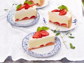 4. Whisk the remaining cream until just holding its shape then spread it over the filling. Halve the remaining strawberries (or slice if large) and scatter over the cream. Chill for at least 3 hours before removing from the tin. Serve scattered with fresh mint leaves.
