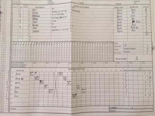 Another change in bowling resulted in yet another wicket. JD was introduced into the attack and struck the first ball, luring the batsmen to drive only to edge it to the keeper. Some fine bowling by Awais and JD combined with some exceptional wicket keeping by Harpreet reduced VCC to 43 for 5.