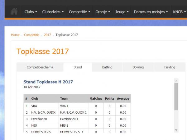 Overigens valt het op dat zonder een wedstrijd gespeeld te hebben een hoop VRA teams momenteel gek genoeg bovenaan in de competitie staan. Wishful thinking of een gunstige voorbode? Een screenshot van de website van de KNCB als voorbeeld: