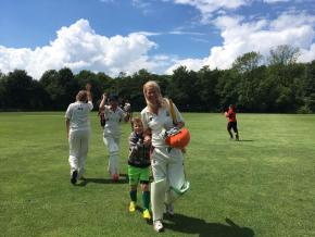 YAY, another home game, wet ground and honestly a bit of a clueless captain. Should we bat or field, there was something to say about both and the situation of an unknown opponent was making my head twirl on the early morning, all very exciting though. Luckily Germany took that decision of my hands during the toss, fielding it was. The umpires told us that Germany is a strong side and while we were having a coffee, their team was warming up. It looked good and we are amazed by the long travels they had to go through to get to our 10.00 game. We were getting ready and pumped to bowl and field with full focus. Everyone was fielding really good, we did give away a fair amount of wides - oops - giving Simon something to focus on coming week haha. First wicket fell by Chavvi, with Sassy getting a beautiful caught behind. Chavvi bowled a great 1-18. The 2nd wicket was a great run out, by quick fielding and good throwing. The 3rd wicket was a catch by our awesome Sally and bowler Icara with the eyes as clear as pools that make you just want to jump in, who was bowling greeat!! If we forget about the first over, she had the amazing figures of 1-5. Katie and Lotte were being a unpasseable wall on point and midwicket all day long. Solid, very solid fielding ladies.