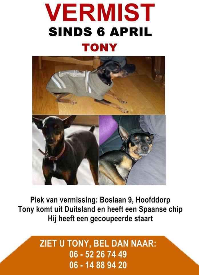 Afgelopen week ontving de redactie van de How's That! een oproep van de Hulpgroep vermiste honden NH/ZH in verband met de vermissing van het Hondje Tony in Hoofddorp. Toni is het hondje van een Duitse chauffeur die in Hoofddorp aan het overnachten was. Daar is het hondje op 6 april verdwenen. Inmiddels zou Tony in Amstelveen en het Amsterdamse Bos zijn gespot.