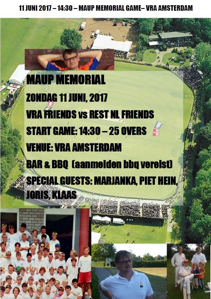 Met in onze herinnering onze zeer goede vriend en fantastische VRA-er Maurits Houben zal er op 11 juni een wedstrijd op VRA georganiseerd worden, tussen spelers die met Maup allemaal een bijzondere relatie hadden en waarvan velen hun sporen in het Nederlandse cricket hebben verdiend. Iedereen is zeer welkom om te komen kijken, er is muziek, drankjes en een bbq!