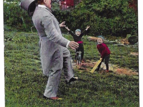Vanaf het prille begin vormen beeld en tekst bij de meeste ansichtkaarten een geslaagde twee-eenheid. Het gaat daarbij primair om ‘Groeten uit…’ en ‘De beste wensen’ in alle mogelijke vormen en varianten. In het postale verkeer manifesteert de mens zich al bijna anderhalve eeuw als een ware heer. Daar wel! Het lag dus voor de hand, dat de wondere woordenwereld van het cricketspel, met zijn onnavolgbare jargon en one liners, al heel snel zijn intrede in de ansichtkaartenindustrie zou doen.