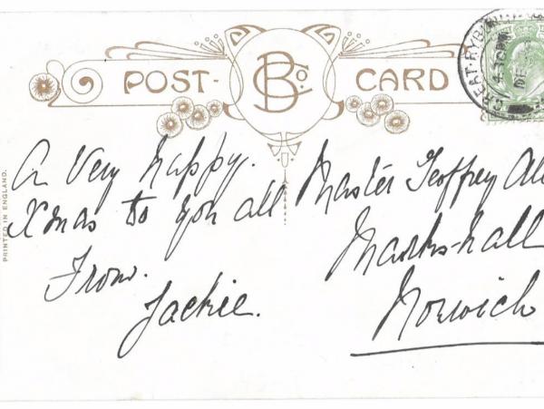 Misschien figureerden daarin die twee guitige knaapjes, bij wie het leedvermaak over hun voltreffer ervan af spat. De kracht van de witte (!) cricketbal waardoor de Willy Wonka-achtige heer wordt getroffen lijkt door de sterretjes gefotoshopt avant la date. En deze prachtkaart werd door afzender Jackie als Kerstkaart (!) verstuurd aan Master Jeoffry Allen in Norwich. Een curieuze keuze. De firma Bamforth startte overigens in 1910 met de productie van zg. ‘saucy’seaside postcards. Die bewaren we voor een andere keer. Of liever toch maar niet?