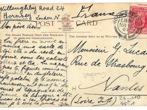 Laat ik beginnen met een ansichtkaart van de hand van Lawson Wood ( 1878 – 1957). Wood was kunstschilder, ontwerper en tekenaar, die zich specialiseerde in politieagenten, dinosauriërs, dieren en …holbewoners. Zijn cricketkaarten vonden gretig aftrek, met name bij niet Engelsen, die zoals we vaker zullen merken, Engelse ansichten verstuurden om het thuisfront een voorbeeld van kenmerkend curieus Brits gedrag voor te schotelen. Zo ook deze kaart, die op 18 maart 1907 om 1:15 pm (dat waren nog eens postdiensten!) verzonden werd van Londen naar Nantes. De afzender schrijft op de voorzijde : ‘un des jeux favoris des anglais, ils y mettent la même ardeur’/ ‘één van de favoriete spelletjes van de Engelsen, zij stoppen er dezelfde passie in’. Dezelfde passie als in al hun andere sporten? Hetzelfde vuur als in al hun overige tijdverdrijf? Interessante vraag, lijkt mij, ook ruim 100 jaar na dato.
