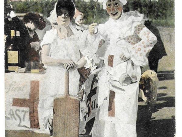 Misschien zoals op bijgaande ansichtkaart, die op 7 augustus 1912 (om 15:00 uur) verzonden werd vanuit Johannesburg naar Parijs. Hierop staan tijdens Fancy Dress Cricket in Johannesburg de ‘Heavenly Twins’. De heren S.Moss en J.MacNamara ( met enigszins gehavende parasol…) vertoonden zich toen in allercharmantste en vertederende dameskleding om een cricketwedstrijd dan wel liefdadigheidsfeestje als hemelse tweeling op te luisteren.