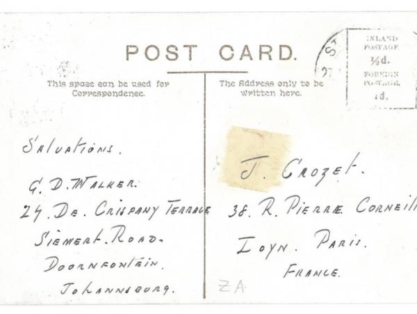 De jolige stemming aan de voorzijde van de kaart zet zich aan de achterzijde voort. Afzender Walker stuurt – mogelijk onder invloed van een glaasje rode Doornfontein - zijn Saluations aan geadresseerde Crozet.