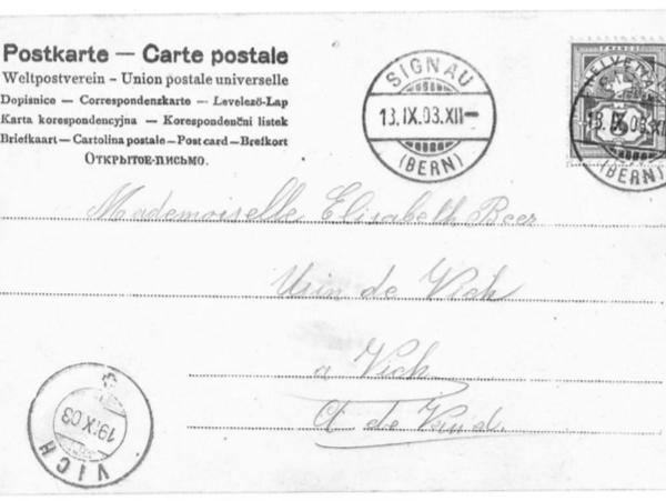 Laat ik beginnen met de status van de kaart. Een product van de in 1874, aanvankelijk als Generale Postunie, opgerichte Wereld Postvereniging. Deze organisatie beoogde de communicatie tussen alle volkeren van de wereld te bevorderen en te ontwikkelen. Ook diende de servicekwaliteit voor de consument verhoogd te worden. Lees: goedkoper, soepeler en sneller postverkeer. Dat laatste is in dit geval niet helemaal gelukt. Signau ( gemeente in het kanton Bern), waar B. de kaart op 13 september 1903 postte, ligt hemelsbreed zo’n 150 kilometer van Vich, waar Elisabeth woonde. De kaart arriveerde daar 6 dagen later…
