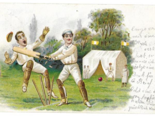 We keren terug naar de beeldzijde van deze begin 1900 door West Zwitserland tourende cricketvoorstelling. Een kaart, waarvan we de maker niet kennen, in de beste traditie van de Engelse laat 19e eeuwse (cricket)aquarel met neo-romantisch aandoende, nogal onwezenlijke figuren. Wat te denken van de serene, welhaast dromerig verrukte uitdrukking op het gezicht van de dandy-batsman, die zich de gevolgen van al het door hem aangerichte ‘kwaad’ volstrekt niet lijkt te realiseren.