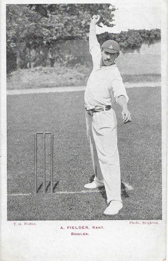 De elegante man op de ansichtkaart moet tijdens zijn bowlingactie wel een metamorfose hebben ondergaan, als we de beschrijving van een tijdgenoot mogen geloven : ‘…Fielder has three distinctive paces when running to the wicket and at each change he bobs his head as if to avoid something hurled at him.’ En daarbij had hij dan vermoedelijk ook nog zijn cap op.