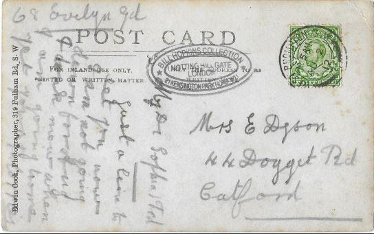 -Een prominent handstempel laat zien, dat de kaart ooit deel uitmaakte van de Bill Hopkins Collection. Deze Hopkins, verzamelaar en handelaar, riep The Postcard Collector’s Centre in Kensington in het leven. Hij plaatste op elke kaart die hij (ver)kocht zijn stempel, tot ergernis van menig verzamelaar.