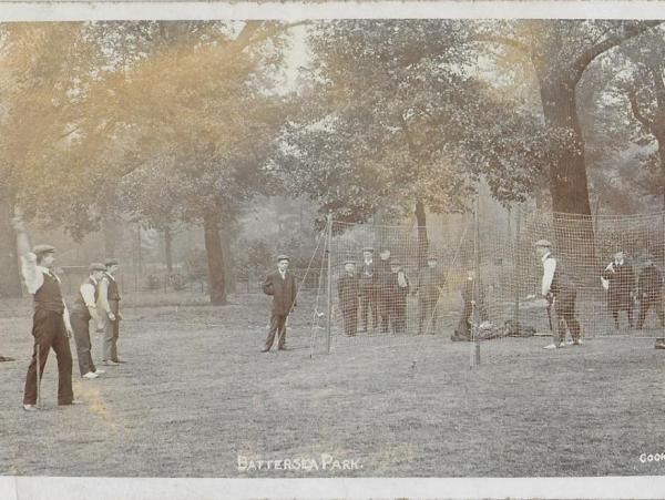 In het westelijk deel van Battersea Park bevinden zich de traditionele Battersea nets, openbaar en toegankelijk voor iedereen. Wel eerst even reserveren. Of dat laatste, rond 1910, toen deze stemmige foto werd gemaakt, ook noodzakelijk was, valt te betwijfelen. Vol aandacht en bewondering wordt deze netpractice gadegeslagen door een overwegend jeugdig publiek. Opmerkelijk detail: álle betrokkenen dragen een pet.