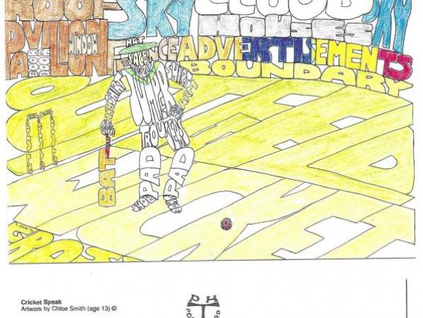Cricket Speak zou je een getekende vorm van concrete poëzie kunnen noemen. De dichter/schrijver drukt in de concrete poëzie zijn of haar gevoelens en gedachten niet op de gebruikelijke wijze uit, maar vertelt het verhaal door een bijzondere klankvorm of aparte grafische weergave te creeëren. Chloe tekent een cricketstadion onder de bijbehorende bewolkte Engelse lucht niet op de traditionele manier. Haar cricketer, cricketveld, cricketstadion bestáán uit woorden, zijn gemaakt van woorden. Een cricketwereld van taal zoals de koekenmannetjes, de suikerbeesten en de taaipoppen van oudsher de grote mensenwereld in snoepvorm voor kinderen uitbeeldden. Je krijgt bijna trek in een hapje ‘bat’, een zoete plak ‘outfield’ of een likje ‘sky’, als je je fantasie de vrije loop laat. Chloe was aardig compleet in haar presentatiepakket ‘Cricket Speak’. Al tellend kwam ik tot 28 woorden ( 2x hetzelfde woord telt natuurlijk maar 1x mee ), maar misschien zag ik iets over het hoofd. Wie ziet en biedt er meer? Overigens is ‘advertisements’ in 4 kleuren met daarboven die eeuwige grijze huizen rond de Engelse stadions wel een ijzersterke beeldende vondst van de 13-jarige Chloe geweest.