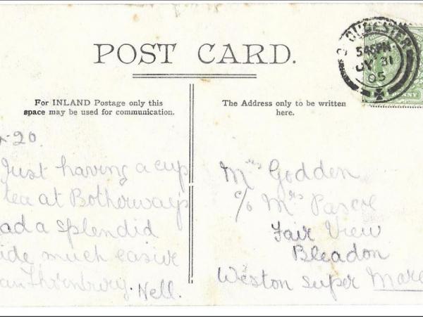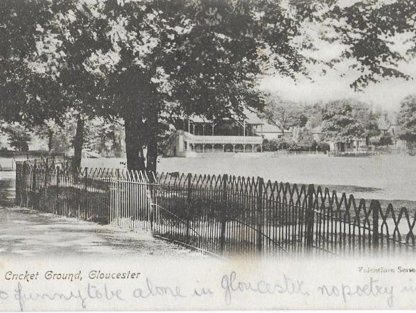 In Gloucester ligt de Spa Cricket Ground, waar vanaf 1867 wordt gespeeld. Tussen 1882 en 1923 door Gloucestershire, en W.G.Grace heeft daar…, maar nee, deze keer geen heldendaden van de dokter. Nell, onze protagoniste van vandaag, stuurde op 31 mei 1905 een kaart naar mevrouw Godden. Zij schreef, dat ze om tien voor half vijf lekker aan de thee zat bij café Botherway ( verdwenen in 1928 ). Ze had een prachtig (trein)ritje achter de rug. Toch voelde ze zich niet helemaal happy, als we de voorzijde van de kaart bekijken.