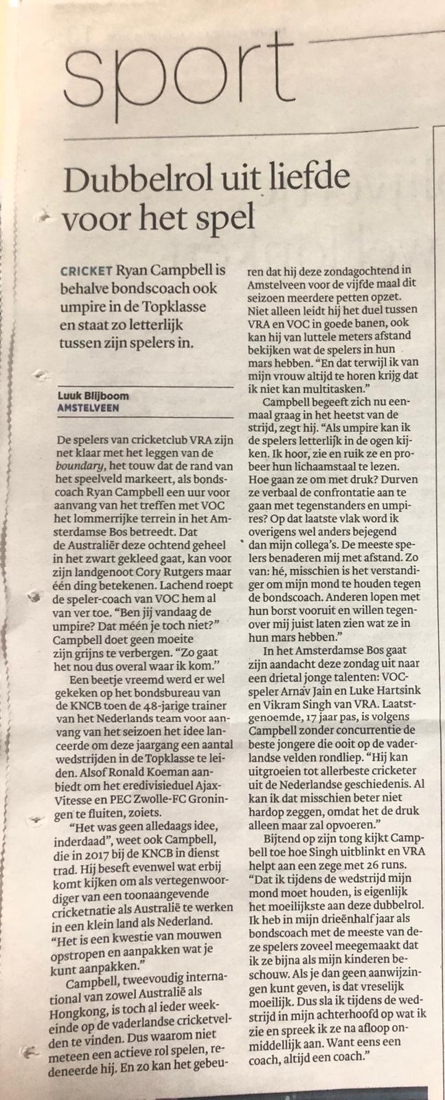 Twee dagen later bleek me uit ooggetuigenverslagen dat ik op de dag dat ik op De Diepput verkeerde eigenlijk op het ACC-veld had moeten zijn, waar Ben Cooper een batting-exhibitie gaf die strandde op 81. VRA leek weer op de goede weg en alles wees erop dat het tegen VOC de schande van Den Haag uit zou wissen. Dat het daartoe kwam was uitsluitend te danken aan Vikram die not out bleef en er uiteindelijk voor zorgde dat VRA uitkwam op 186 runs, een totaal dat VOV te machtig bleek. Daarna was het ouderwets goed toeven op het terras. De zon scheen uitbundig, rosé en bier vloeiden rijkelijk en aan sterke cricketverhalen was geen gebrek. Vergeten leek het cricketloze tijdperk. Iedereen maakte zich op voor een lange, hete augustusmaand vol cricketgenot. Ik zal er geen minuut meer van missen.