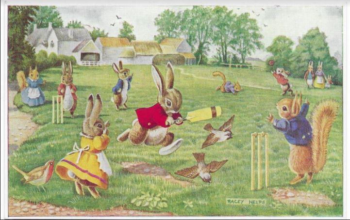 De titel van deze ansicht uit de jaren ’50 luidt ‘Hit for six’ en dat levert de nodige hoofdbrekens op. Allereerst staat het begrip cricketwedstrijd op losse schroeven, tenzij Helps de kijker een visionaire versie van ‘Last man standing’ wilde voorschotelen. We zien immers geen ‘running mate’ van de roodgejaste haas. Het meest voor de hand liggend is wellicht, dat hier een bosversie van tip and run wordt gespeeld. En als de bowler – welk van de dieren zou daarvoor overigens in aanmerking moeten komen ? – al voor 6 wordt geslagen, waarom runt die batsman dan alsof zijn leven ervan afhangt? Toegegeven, dat zit in de aard van het beestje, maar een cricketende haas, die een 6 slaat, gaat er niet als diezelfde spreekwoordelijke haas vandoor. Hij loopt hoogstens een eindje de pitch op kijkt de bal genietend na. En tenslotte, wat zijn die twee fielders aan de boundary nou precies aan het doen? De blauwe eekhoorn is op zijn snufferd gevallen en het rode haasje lijkt een simpele vang te gaan maken of te missen. Hit for six?