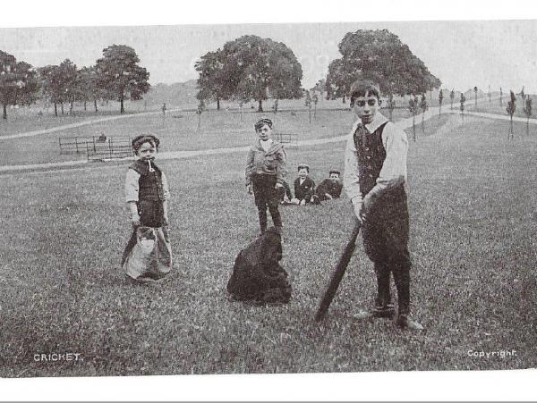 Onder de benaming ‘Edwardian boys playing cricket’ en soms ook ‘Cricket in Ireland’( geen idee waarom), maakte deze ansichtkaart ruim 100 jaar geleden zijn opwachting in ‘The Star Series’. Dat waren kaarten, die de firma G.D. & D. ( Gottschalk, Dreyfuss & Davis Co Ltd. of London) begin 20e eeuw op de markt bracht. Deze heren, die in New York zetelden, maakten gebruik van een verworven Londens fotoarchief waarbij ze de geretoucheerde originelen tot ansichtkaart omtoverden. Vaak van inferieure druktechnische kwaliteit. Maar met originele voorstellingen.