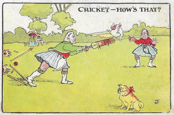 Kijk, hier hebben we een substantieel deel van de ingrediënten van de ansichtkaart: een bal, een gebroken wicket, een hond (min of meer) en een Schot. Want Tilly Lally. de zanger van het lied, was niemand anders dan de Schotse journalist Alexander Tilloch, één van Blake’s kroegmaten met wie naar hartelust gedicht, gedronken en gezongen werd. En die turd dan? Die zou wel eens door die bestrikte buldog geproduceerd kunnen zijn. Maar ja, op blote voeten wordt hier niet gerund en William Blake signeerde nooit met J.F.