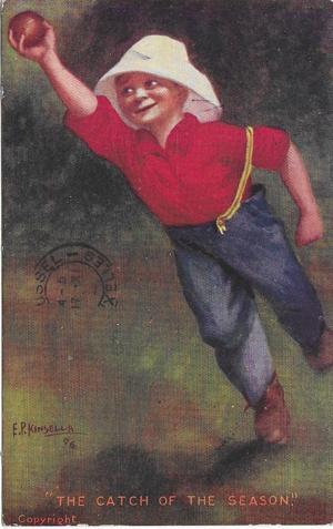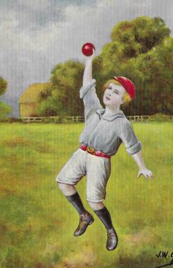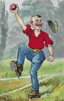 Het breeduit grijnzende joch rechts is beslist de meest expliciete rood-blauwe ‘catch of the season’ die ik ken. De kaart werd mij overigens ooit aangeboden met de tekst; “Heel oud prentje van een honkballertje, meneer. Zeldzaam, hoor.” De verkoper had voornamelijk oog gehad voor de spikes en de krijtlijnen. De rode bal en de cap wijzen in een andere richting en waar is de honkbalhandschoen? Maar het blijft een hybride aangelegenheid op deze kaart van de mij onbekende Fred Neumuth.
