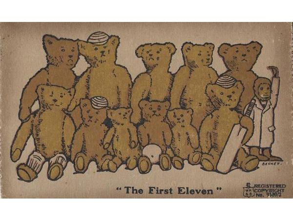 Deze zeer innemende ansichtkaart, die in het begin van de 20e eeuw met een nieuwjaarswens op Guernsey werd verstuurd, maakte deel uit van de klassieke WR&S ( William Ritchie and Sons) Reliable Series. Dat waren kaarten van stevig karton, die je met een gerust hart op de bus deed. Degelijk en betrouwbaar. Kwalificaties, die ook van toepassing zijn op de elf beren en beertjes van 'Het Eerste'. Wie er voor de lagere berenteams uitkwamen weten we niet, maar deze elf vormden in ieder geval een fraaie mix. Een team waar de jeugd een kans kreeg en kon profiteren van berenveel ervaring op de achterste rij. Waarom de geestelijke vader van dit pluche elftal, de tekenaar Becket, voor een aap als umpire koos, zal altijd wel een raadsel blijven. Umpires staan, dat klopt, en vaak heel lang, maar toch niet voor ...Tom Matena