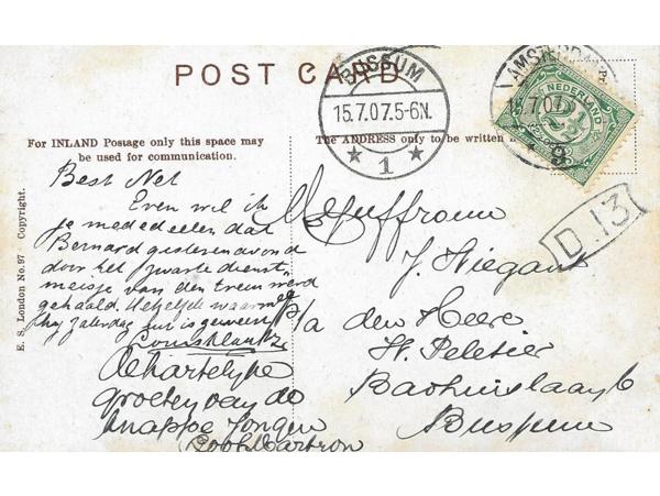 De kaart werd op 15 juli 1907 door Louis K. en Dolf M. naar een juffrouw in Bussum gestuurd. Dolf deed, op zijn manier, de groeten, maar de boodschap van Louis verdient beslist nadere aandacht:
