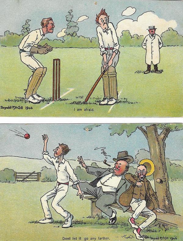 Beide kaarten uit 1906 zijn verre van aanstootgevend te noemen. Eerder correct en braaf, wellicht iets té. McGill werd in die dagen qua stijl sterk beïnvloed door Tom Browne, de meester-van-de-klare-lijn (zie How’s That 4 juni 2020). De bewegelijkheid van Browne’s figuren treffen we bij Mc Gill echter veel minder aan. Het komt allemaal wat stijfjes over. Opvallend is ook, dat veeltekenaar McGill zijn personages vaak ‘hergebruikt’. Wie aandachtig kijkt, zal zien dat de umpire en de batsman van ‘I am afraid’ bij de volgende kaart op het bankje zijn beland. Flink wat jaren ouder. De eerste met een inmiddels grijze snor, de ander kaler en met een fondsbrilletje. De fielder oogt als een tweelingbroer van de wicketkeeper te met dezelfde verbeten kaaklijn, maar een woester kapsel. Overigens leidt dit keer niet de voorzijde, maar de achterkant van een ansichtkaart van McGill tot meer dan een gefronste wenkbrauw.