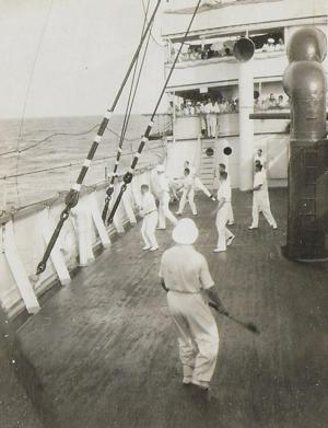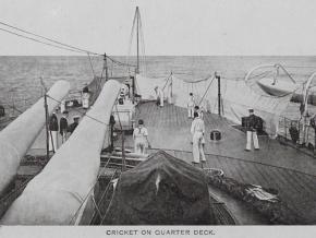 De bemanning van het slagschip ‘HMS Irresistible’ (bouwjaar 1898) bedacht in de beginjaren van de vorige eeuw een vermakelijke vrijetijdsbesteding: cricket op het achterdek. Er werd ‘tip and run’ gespeeld. Was er daarbij sprake van een run out, dan was de striker altijd de pineut. Slimme batsmen sloegen de bal in een luik, want van ‘lost ball’ was er geen sprake. Het echte probleem bij dit spelletje was niet man, maar bal overboord. Daar had men een onverbiddellijke sanctie voor bedacht: bal in zee, gehele battingside uit! Dus niet 6 en uit, maar 0 en all out … We zien het op bijgaande foto-/ansichtkaart (bijna?) gebeuren. Geweldige ambiance!