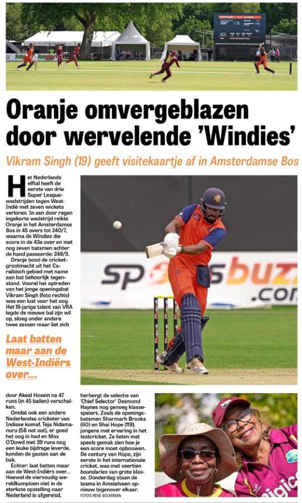 In de ochtend speelde Vikramjit Singh de sterren van de hemel. De man, die op zondagochtend de velden uitzet voor jeugdwedstrijden bij VRA, sloeg de ene bal na de andere voor vier en ging met een onwaarschijnlijke bravoure van start. Alsof hij zelf ondanks zijn jeugdige leeftijd een oude Westindiër was. Hij batte met de klasse van Vivian Richards, de bravoure van Richie Richardson en opende ondertussen alsof hij zelf Desmond Haynes en Gordon Greenidge tegelijk was. Zelfs de spelers van de West Indies moeten er van genoten hebben. En ondertussen zat er geen hond op de tribune. Surrealistisch…