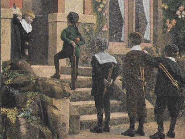 Een plaatje! Ik heb de indruk, dat Dora doorhad, dat Tommy King met evenveel plezier naar school ging als de Tom, die hier door zijn vriendjes wordt opgehaald. Een geweldig verbond, dit viertal. Keurig gekleed, voorbeeldig op een rijtje achter elkaar. Daar kan toch niets mis mee zijn, zal de ansichtkaartenmoeder van Tom hebben gedacht. En intussen verbergen die baasjes op hun rug alles om er een geweldig sportief ochtendje zondagsschool van te maken. Zelf bezocht ik nooit een zondagsschool, maar in de eerste klas van de HBS genoot ik wel onderwijs in het vak Cultuurgeschiedenis van het christendom. Wij noemde het ‘Bijbel gooien’, want door het klaslokaal vlogen met grote regelmaat dundrukpapieren vliegtuigjes. Op vleugels en romp vielen overduidelijk delen uit Jesaja, Jeremia en andere grote profeten waar te nemen. Het Woord in de allengs dunner wordende bijbels was in die tijd aan ons wel besteed, maar niet op de wijze zoals het bedoeld was. Nichtje Dora bleef, ondanks enige scepsis, hopen op schriftelijke tekenen van leven uit Cantou. Haar kaart eindigt dan ook met de boodschap :