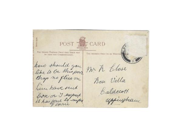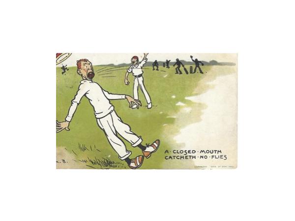 Tom Browne groeide op als kind in en van de 19e eeuw, toen de opvoedkundige aspecten in de jeugdboeken niet mis te verstaan waren. Kinderlijke vergrijpen werden daarin op meedogenloze en soms gruwelijke wijze bestraft. Piet de Smeerpoets en het kwajongensduo Max en Moritz kunnen erover meepraten. De liefhebbers van zwarte humor komen bij deze lectuur volledig aan hun trekken. Zo bont maakte Tom Browne het nou ook weer niet, maar het boontje-komt-om-zijn-loontje-effect op de door hem getekende kaarten is rijkelijk vertegenwoordigd. Wie te zwaarlijvig is, gaat run out, wie dom bat, sneuvelt op de eerste bal ( ‘Great Scott, how did that happen?’) en wie te veel kletst wordt snoeihard de mond gesnoerd: “A closed mouth catcheth ( mooi die Shakespeareaanse spelling) no flies.” Eigen schuld, dikke bult. Opmerkelijk is de reactie van de afzender van deze kaart, die rond 1910 vanuit Leicester naar het nabijgelegen Uppingham werd verstuurd.